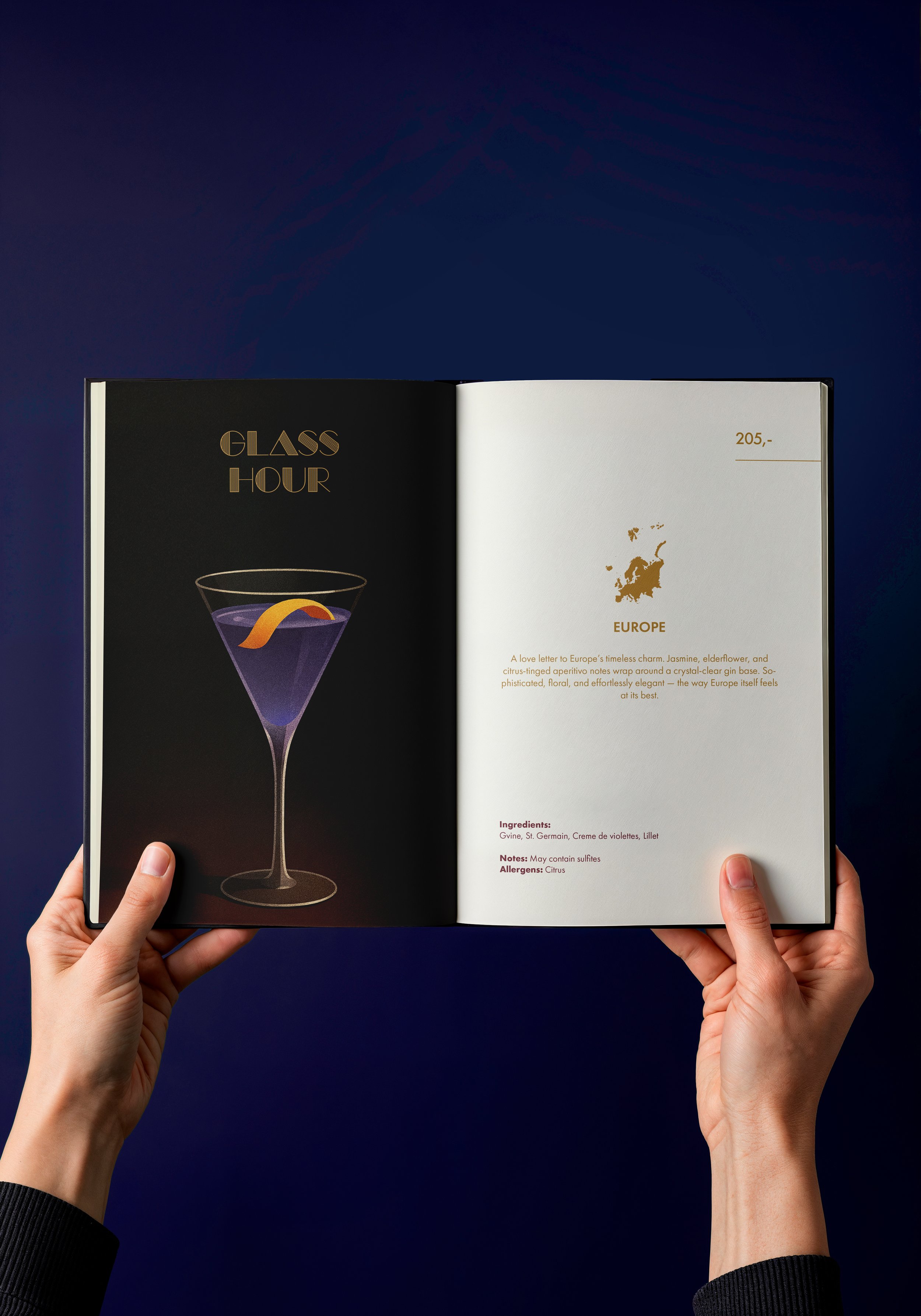 Seven ønsket et elegant og profesjonelt design til sin nye cocktailmeny, en meny som ikke bare presenterer drinker, men forteller en historie. Hele konseptet bygger på idéen “A Journey in Seven Glasses”, hvor hver cocktail representerer et kontinent gjennom smak, følelse og kultur. Målet var å skape et visuelt uttrykk som forsterket denne reisen, samtidig som menyen skulle være tydelig, moderne og i tråd med Sevens Art Deco-inspirerte profil.