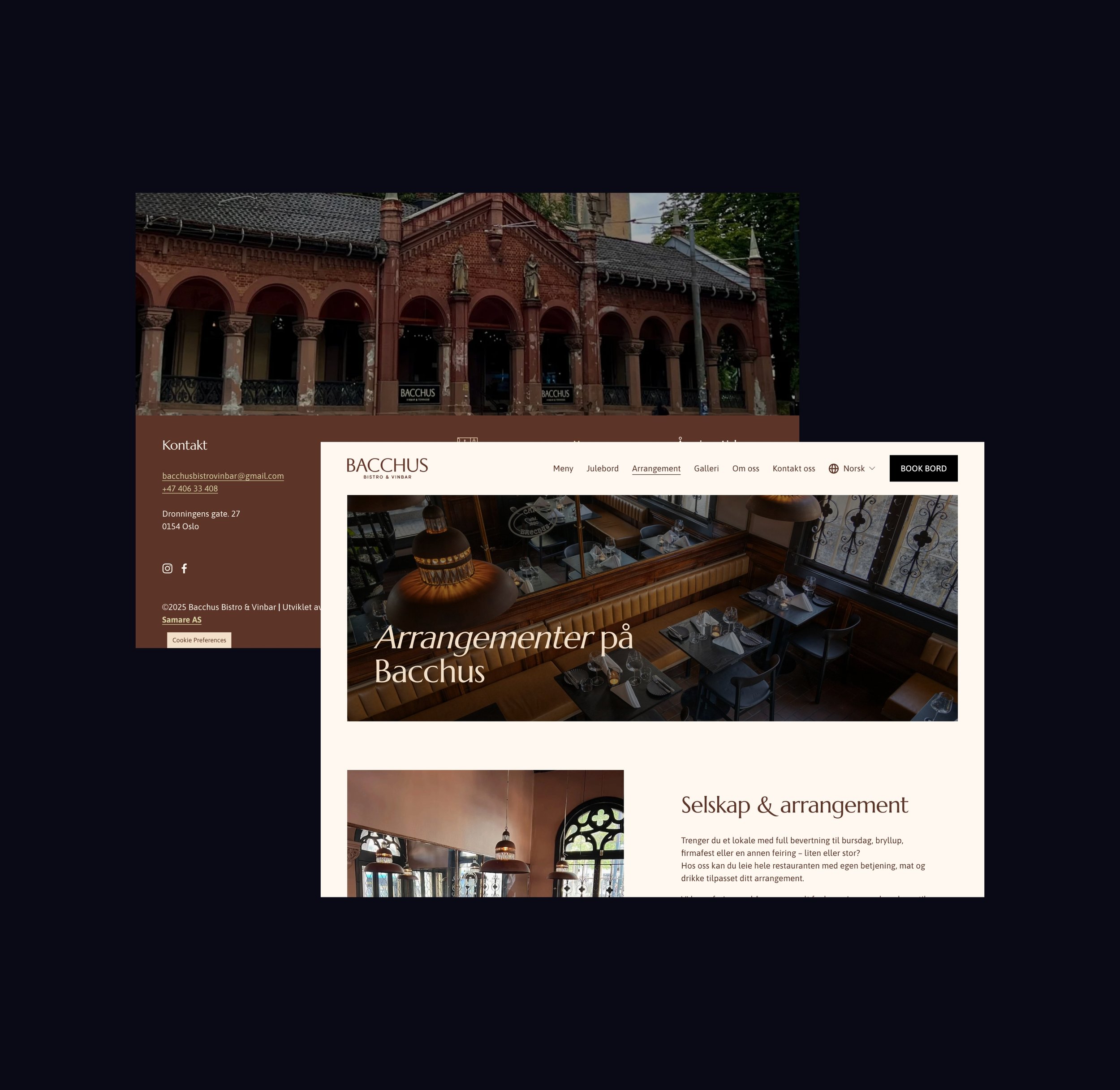 Parallelt utviklet vi en ny nettside i Squarespace, bestående av seks sider. Løsningen er bygget med fokus på enkel struktur, god flyt og et visuelt uttrykk som harmonerer med menyen og stemningen i lokalet. Samtidig er nettsiden lagt opp slik at Bacchus enkelt kan gjøre endringer selv over tid.