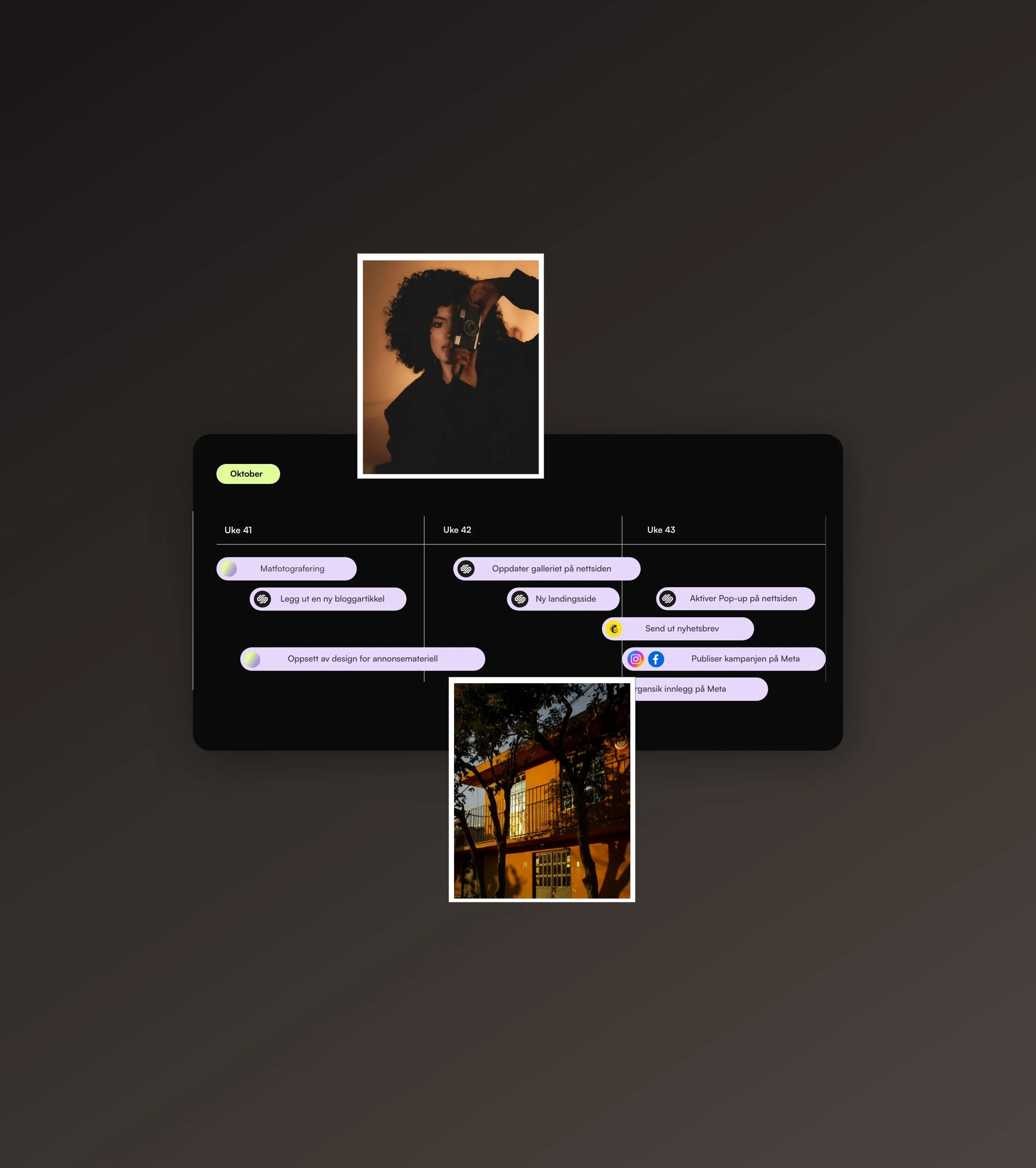 Vi produserer profesjonelt foto og video som formidler budskap, stemning og kvalitet, tilpasset digitale flater og markedsføring.